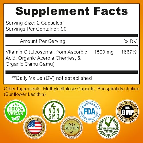 As cápsulas de vitamina C lipossomal – 1500mg – feitas com cerejas orgânicas de acerola são um suplemento de alta potência que oferece uma série de benefícios para a saúde. Nossa fórmula poderosa de vitamina C lipossomal é aprimorada com cerejas orgânicas de acerola e camu camu orgânico para um impulso extra de vitamina C de alimentos integrais, e é feita com lecitina de girassol para uma absorção superior.