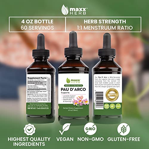 Maxx Herb PAU D’Arco Tincture – Max Strength PAU D’Arco Extract for Immune Support, Taheebo Tea Inner Bark Absorbs Better Than PAU Darco Capsules – 4 Oz Bottle (60 Servings)