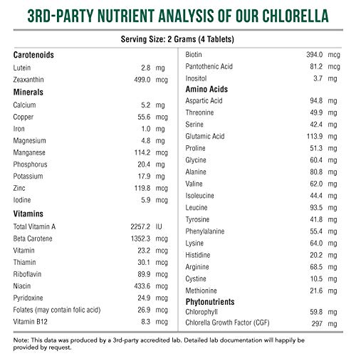 Testado por Terceiros, 100% Livre de Contaminantes: A Chlorella Orgânica BioChlorella é cultivada em uma região ambientalmente pristina do sul da Índia, com abundante luz solar, água purificada 100% e fertilizantes à base de plantas, seguindo os mais rigorosos padrões orgânicos e de qualidade do mundo. Ela também é testada por terceiros para metais pesados, mofo, E. coli, BMAA, microcistinas, feoforbide, irradiação, tratamento químico, OGMs, solventes, aglutinantes, soja e gelatina.