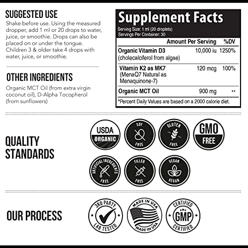 A forma líquida sublingual deste produto demonstrou ter uma absorção até 300%% maior do que cápsulas e comprimidos. Além disso, o Organic Plant-D3 K2 é certificado organicamente pelo USDA e excede todos os padrões veganos. É livre de OGM, soja, glúten, conservantes e aditivos. É produzido em uma instalação certificada cGMP e orgânica nos EUA e é testado por terceiros para mais de 100 toxinas ou microbianos.