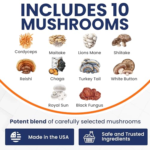 Suplemento de Cápsulas de Cogumelo – Complexo de 10 Cogumelos com Lion’s Mane, Cordyceps, Shiitake e Reishi – Suplementos de Vitaminas Herbais Naturais para Foco e Energia