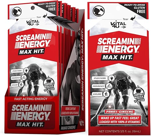 O Screamin Energy Max Hit é um energético pronto para beber que oferece uma explosão de energia instantânea. Com apenas 1 fl. oz. por porção, nossa fórmula poderosa contém café real, cafeína, panax ginseng e vitaminas essenciais do complexo B, proporcionando um impulso energético duradouro.