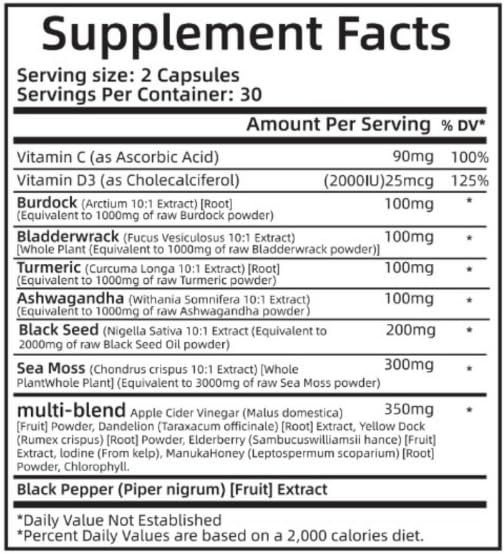 Blend Completo: Contém sea moss, black seed oil, ashwagandha e gengibre para suporte holístico à saúde.