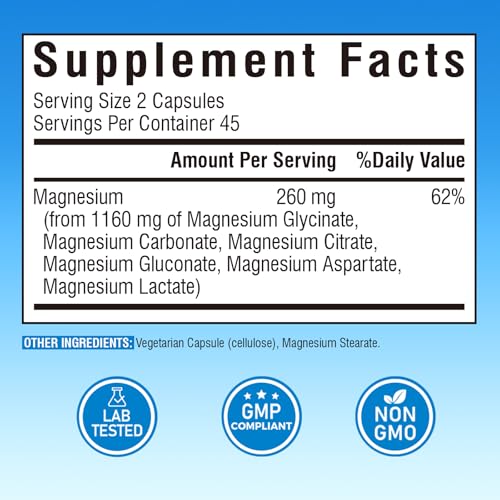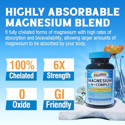 O Suplemento de Complexo de Magnésio 1160mg para Sono e Nervos da Vitalibre é a solução perfeita para quem ama magnésio, mas não gosta dos impactos digestivos que ele pode causar. Nosso complexo de magnésio 6 em 1 inclui magnésio glicinato, citrato, gluconato, carbonato, aspartato e lactato (sem o menos absorvível óxido de magnésio). Esse suplemento de magnésio de alta absorção permite que o seu corpo utilize o magnésio de forma mais eficiente e é suave para o estômago.*