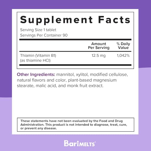 Para obter os melhores resultados, tome um comprimido de vitamina B1 BariMelts por dia. Coloque o comprimido na boca e deixe-o dissolver completamente antes de engolir. Não exceda a dose recomendada, a menos que indicado por um profissional de saúde. Armazene em local fresco e seco, longe da luz solar direta. Consulte um médico antes de iniciar qualquer suplemento alimentar.