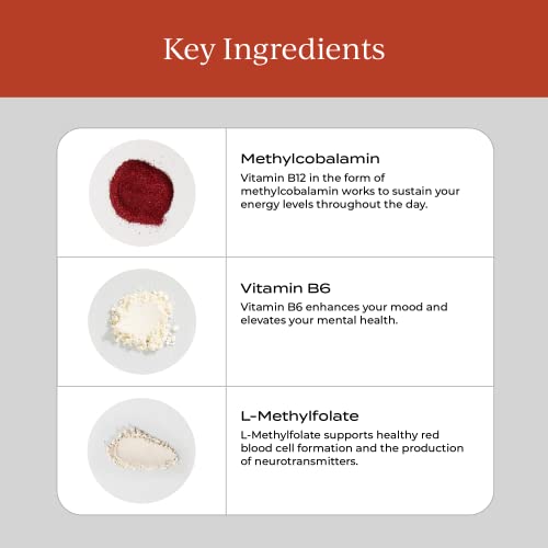 A vitamina B12 desempenha um papel vital na produção de células e é essencial para a saúde do cabelo, pele e unhas. Ela fornece às células energia natural, ao contrário da cafeína, e essa energia celular é fundamental para uma sensação geral de bem-estar e melhor foco. Além disso, a vitamina B6 presente nesse suplemento melhora o humor e a saúde mental. A inclusão de l-metilfolato na fórmula também auxilia na formação saudável de glóbulos vermelhos e na produção de neurotransmissores, o que pode ajudar em problemas de saúde mental.