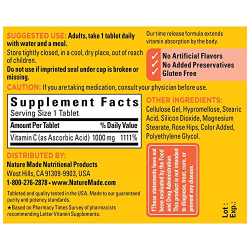 Contém um suprimento de 60 dias de Nature Made Vitamina C 1000 mg com Rose Hips Time Release Tablets, 60 comprimidos por frasco.