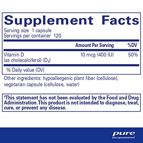 A Vitamina D3 da Pure Encapsulations é um suplemento de alta qualidade que oferece suporte essencial para a saúde óssea, mamária, cardiovascular, colônica e imunológica. Cada cápsula contém 10 mcg (400 UI) de vitamina D3, uma forma altamente absorvível de vitamina D.