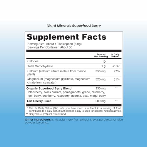 Além disso, Night Minerals é a única bebida de magnésio que combina magnésio glicinato e suco de cereja azeda em pó, os dois ingredientes principais do popular drink Sleepy Girl Mocktail. Você também pode criar seu próprio Sleepy Girl Mocktail combinando cerca de uma colher de sopa de pó com sua bebida gaseificada com sabor preferida e desfrutar de uma experiência única.