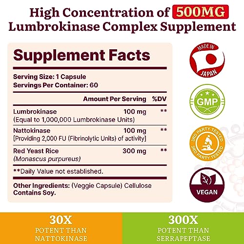 FÓRMULA POTENTE 3 EM 1 – Inclui 100 mg de lumbroquinase (atividade máxima de 1.000.000 LKU), 100 mg de nattokinase (fornecendo 2.000 FU de atividade) e 300 mg de arroz de levedura vermelha. A lumbroquinase é excepcionalmente potente, sendo 30 vezes mais forte que a nattokinase e aproximadamente 300 vezes mais potente que a serrapeptase. Sua atividade fibrinolítica superior a torna altamente potente. O suplemento enzimático de lumbroquinase oferece a escolha ideal para o bem-estar corporal.